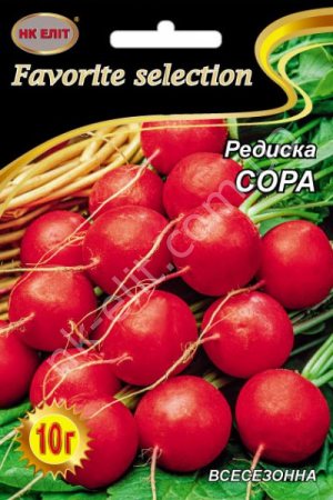 Раннеспелый - 20-23 дня. Листья небольшие. Корнеплоды круглые, темно-красного цвета, массой 30-35 г, диаметром 4-5 см. Мякоть белая, слабо-острый, сочный. Урожайность 1,4-2,2 кг/м2. Вкусовые качества отличные. Используют в свежем виде. Культура холодостойкая. Очень долго сохраняет товарные качества. Хорошо переносит засуху. Устойчив к цветухе. НЕ трухлявеют. Выращивают, как весной, так и осенью. Во влажной почве всходы появляются на 6-7-й день после посева. Глубина посева 2-3 см.