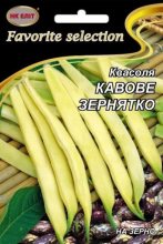 Висоврожайний смачний сорт. Дозріває через -100-105днів після всходів. Рослина кущового типу, кущ компактний, висотою 35-40см, не потребує підв’язки. Боби довгі, жовті до 20см, містять до 10 зернин. Зрілі зерна дивовижні за кольором та розміром – нагадують зерна добірної кави. Смак зерна відмінний, маслянистий, насичений. Сорт лущильний призначений для збору повністю дозрівших квасолин. Квасоля використовується для приготування різних страв, консервування та заморозки. Рослинам потрібен полив, прополка, розпушування та підживлення.